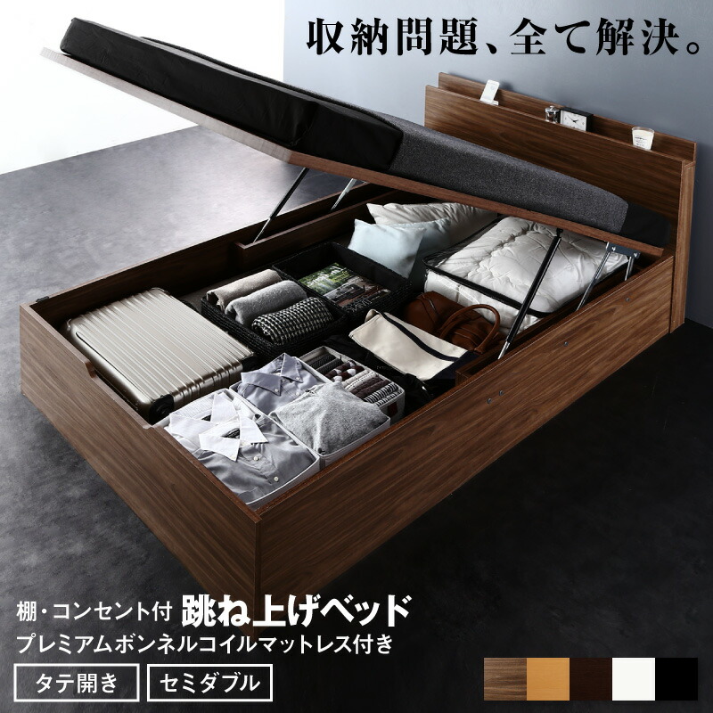 とっておきし福袋[組立設置付]棚付き 大容量収納 跳ね上げベッド [ネオグランスタ2] [プレミアムボンネルコイルマットレス付き] 縦開き セミダブル [フレーム]ダークブラウン [マットレス]ホワイト